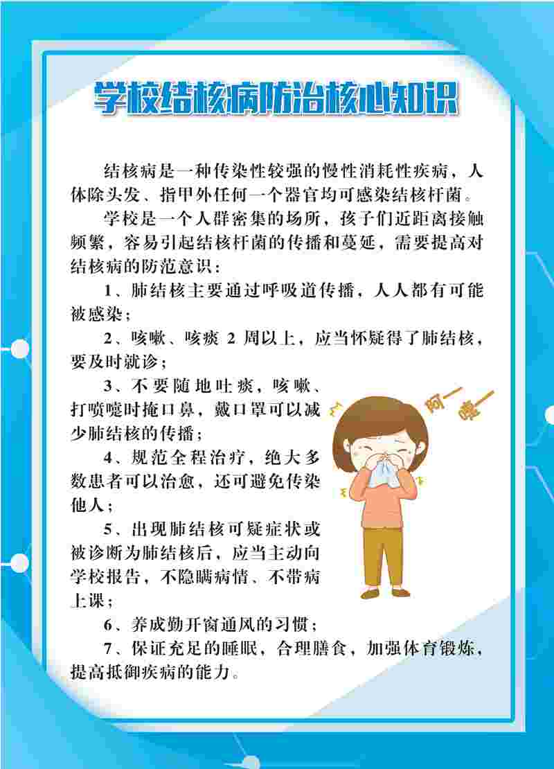 一般而言,連續咳嗽、咳痰兩周以上,或咯血、血痰等,就被視為肺結核可疑癥狀者。發現疑似結核癥狀應當第一時間報告學校,并及時到正規醫院檢查確診和規范治療,以免自行服藥致使癥狀遷延不愈,甚至傳染給身邊同學。其實,結核病可防可控可治,并不可怕,只要早期發現并采取科學合理的治療手段,其治愈率非常高,且越早治療效果越好。