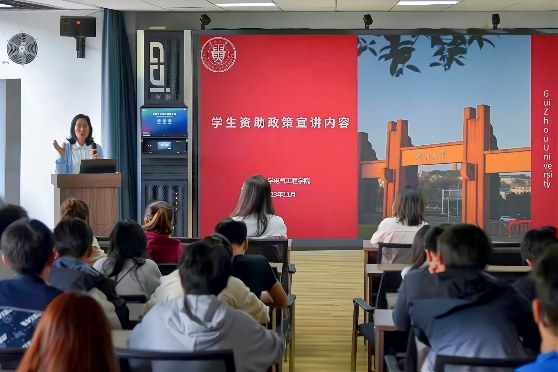 宣講現(xiàn)場,侯亞兵從資助工作的重要意義、資助政策、本校資助體系、資助的原則和要求等方面進(jìn)行詳細(xì)講解。