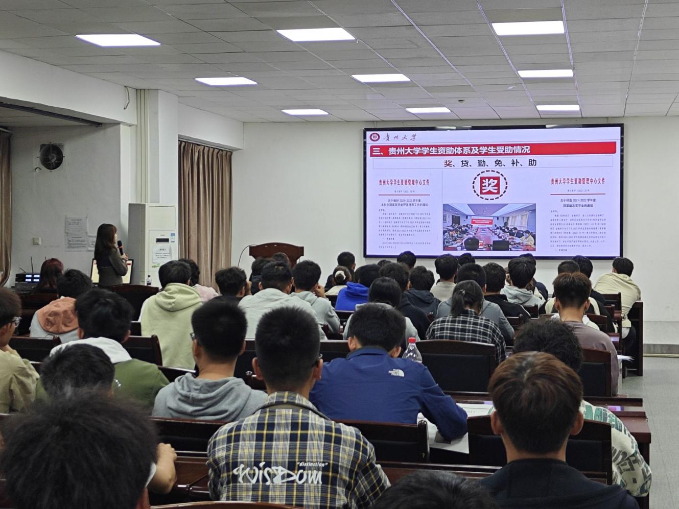 宣講現場,蘇陽首先從開展資助工作的重要意義、資助政策、本校資助體系、學生受助情況、資助工作的開展以及凸顯育人成效等方面進行講解,同時對班委如何開展資助工作提出具體要求。隨后,羅鑫要求各班認真組織學習資助政策,務必把會議內容精準傳達到每位同學。
