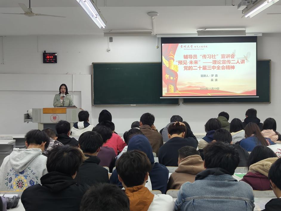 為深入學(xué)習(xí)貫徹黨的二十屆三中全會(huì)精神,加強(qiáng)2024級(jí)學(xué)生對黨的知識(shí)理論的學(xué)習(xí),電氣工程學(xué)院于2024年11月19日在東樓303D舉辦了輔導(dǎo)員“傳習(xí)社”宣講會(huì)——“預(yù)見·未來”理論宣傳二人講活動(dòng)。本次活動(dòng)由2024級(jí)輔導(dǎo)員羅鑫老師主持,并與電自222吳浪共同主講,活動(dòng)現(xiàn)場有80余名同學(xué)參加。